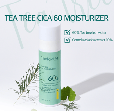 Η ενυδατική κρέμα Tea Tree Cica 60 της Thelavicos περιέχει 60% εγχώριο εκχύλισμα από φύλλα τεϊόδεντρου, το οποίο καταπραΰνει και ενυδατώνει αποτελεσματικά το δέρμα που έχει ερεθιστεί από εξωτερικούς παράγοντες.