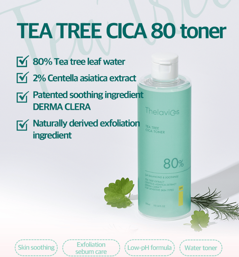 Το Thelavicos Tea Tree Cica 80 Toner περιέχει 80% εγχώρια παραγόμενο νερό από φύλλα tea tree, προσφέροντας πιο στοχευμένη καταπραϋντική και ενυδατική δράση.